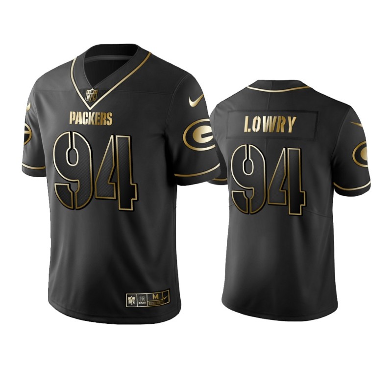 Every fan has various pieces of fan apparel that are a little different from the standard clothing that makes up most of their wardrobe or collection, and this Men Green Bay Packers #94 2019 Golden Edition Vapor Untouchable Limited Dean Lowry Black Jersey - Men's will definitely stand out from the others. The Gold Vapor Untouchable Limited jersey design includes a golden team graphics screen-printed on the front and on both sleeves, the golden player's name and number on the the front and back.