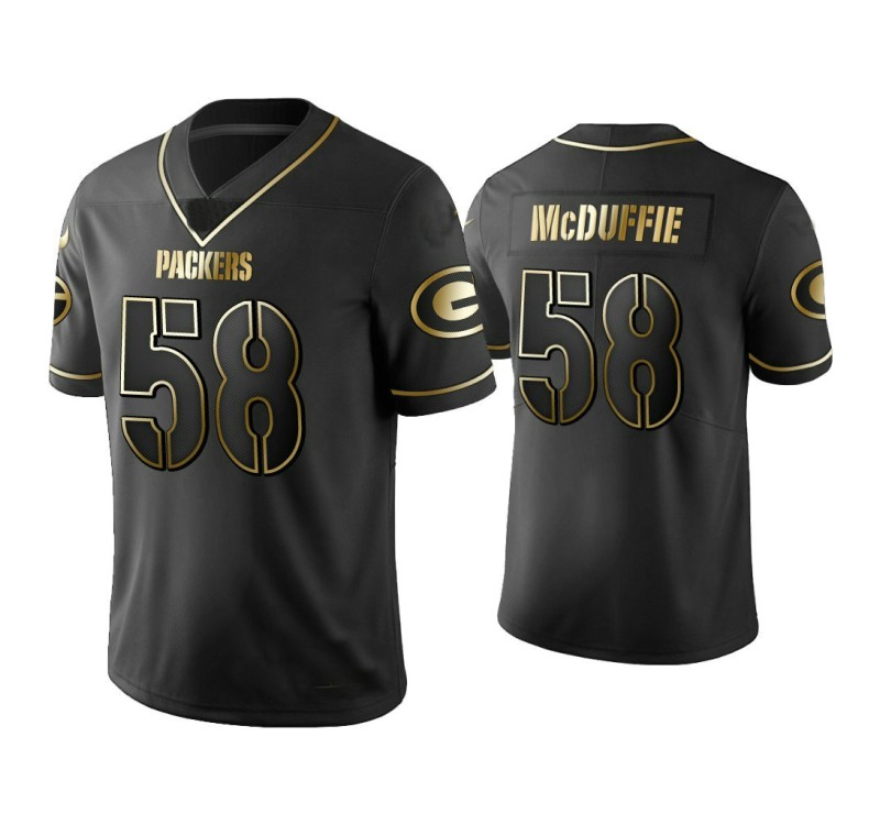Every fan has various pieces of fan apparel that are a little different from the standard clothing that makes up most of their wardrobe or collection, and this Men Green Bay Packers #58 Golden Edition Vapor Limited Packers Isaiah McDuffie Black Jersey will definitely stand out from the others. The Gold Vapor Untouchable Limited jersey design includes a golden team graphics screen-printed on the front and on both sleeves, the golden player's name and number on the the front and back.
